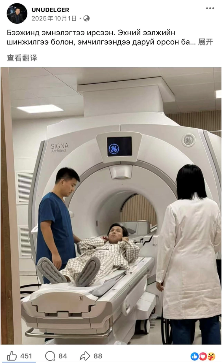 2025年10月1日,32岁的蒙古国患者Unudelger抵达天津并入院治疗后,他在Facebook上发布了一张自己正在进行核磁共振(MRI)检查的照片,向朋友们汇报情况。第二天,他发帖称自己身体状况稳定。之后一个月里,他陆续发了多条帖文,记录自己在中国治病的经历。